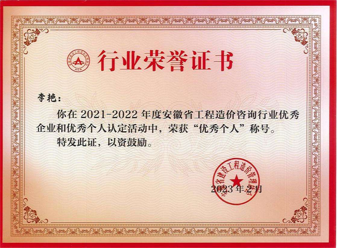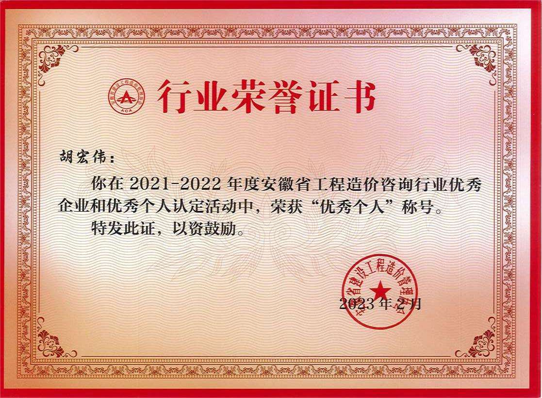 为充分发挥我省优秀工程造价咨询企业和个人的引领带动作用,促进造价咨询业的健康发展,根据《工程造价咨询行业优秀企业和优秀个人认定暂行办法》的规定,安徽省建设工程造价管理协会研究决定开展了2021-2022年度安徽省工程造价咨询行业优秀企业和优秀个人认定活动。我司通过自主申报参加了此次评选,经协会组织专家评审,主管部门复核,安徽省华都工程咨询有限公司被评定为“2021-2022年度安徽省工程造价咨询行业优秀企业”,我司李艳、胡宏伟被评为“2021-2022年度安徽省工程造价咨询行业优秀个人”。公司在此表示祝贺,希望获得先进的同志保持谦虚谨慎,再接再厉,同时呼吁公司全体同仁向他们学习,以饱满的热情和责任心,在各自岗位上尽职尽责,奋进有为!