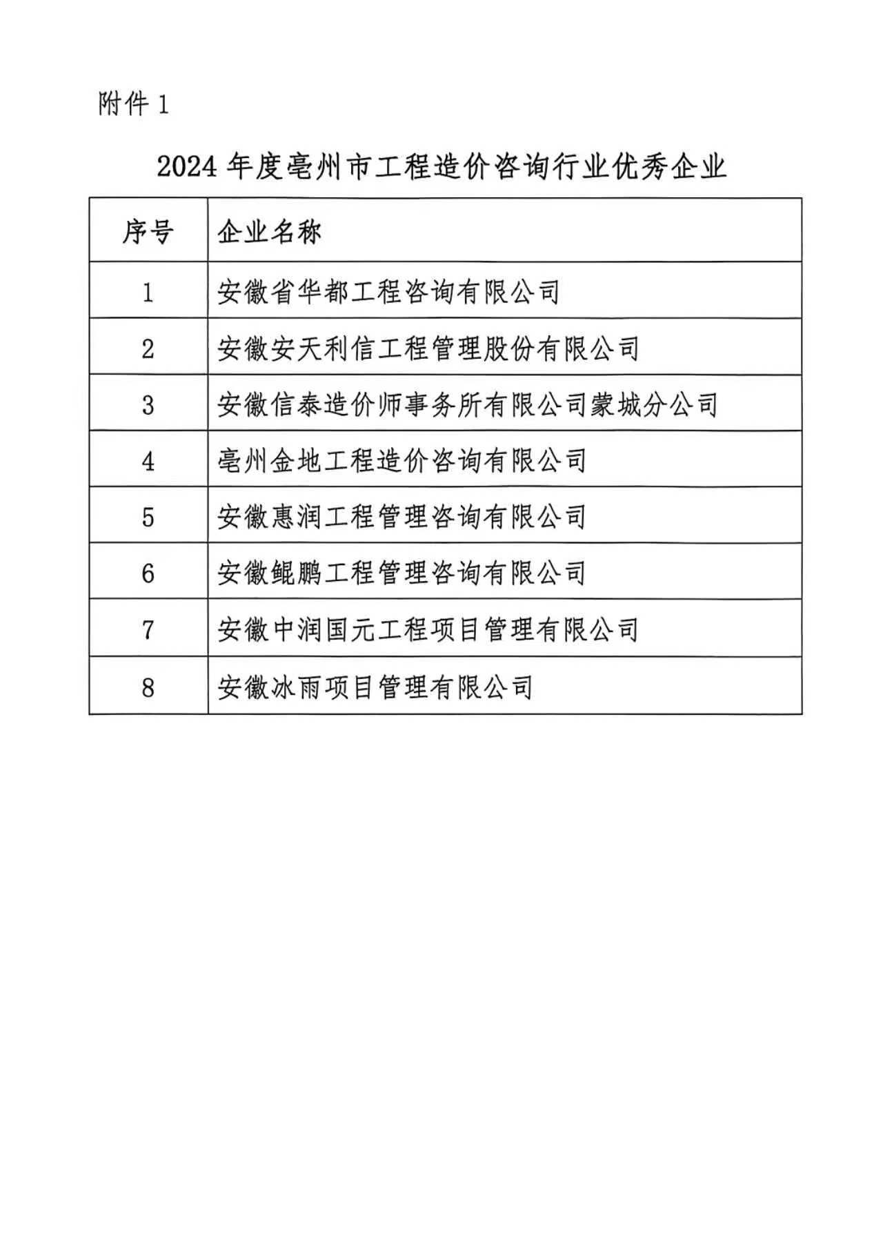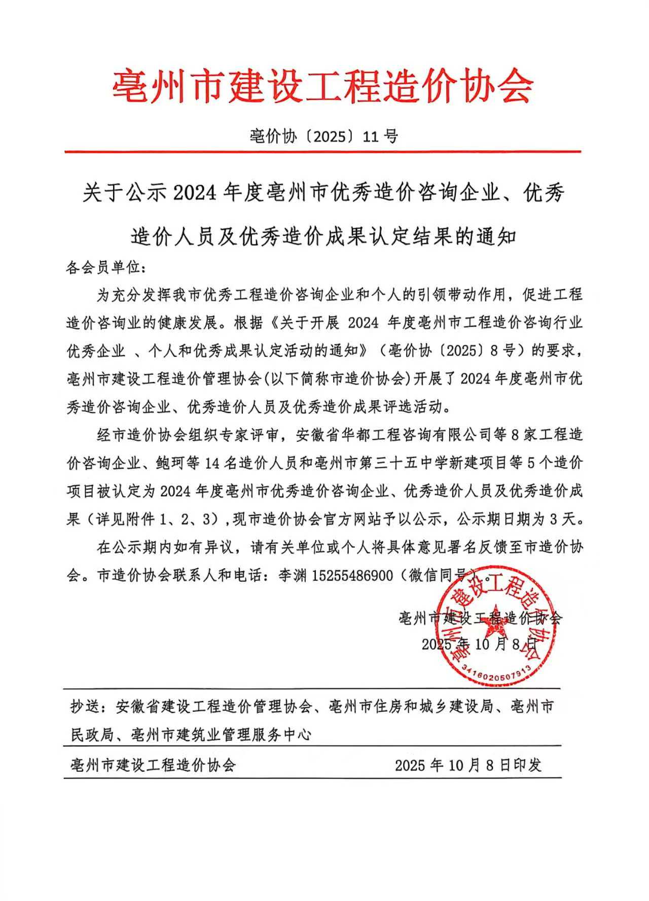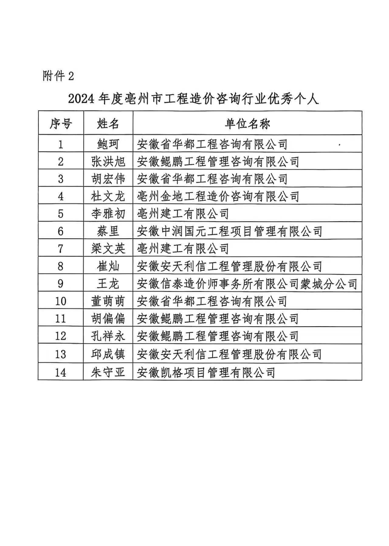 关于公示2024年度亳州市优秀造价咨询企业、优秀 造价人员及优秀造价成果认定结果的通知