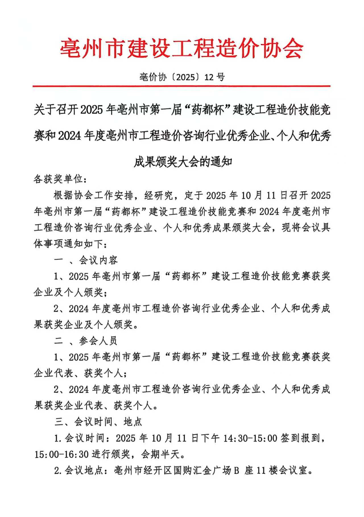 关于召开2025年亳州市第一届“药都杯”建 设工程造价技能竞赛和2024年度亳州市工程造价咨询行业优秀企业、个人和优秀成果认定活动颁奖大会的通知