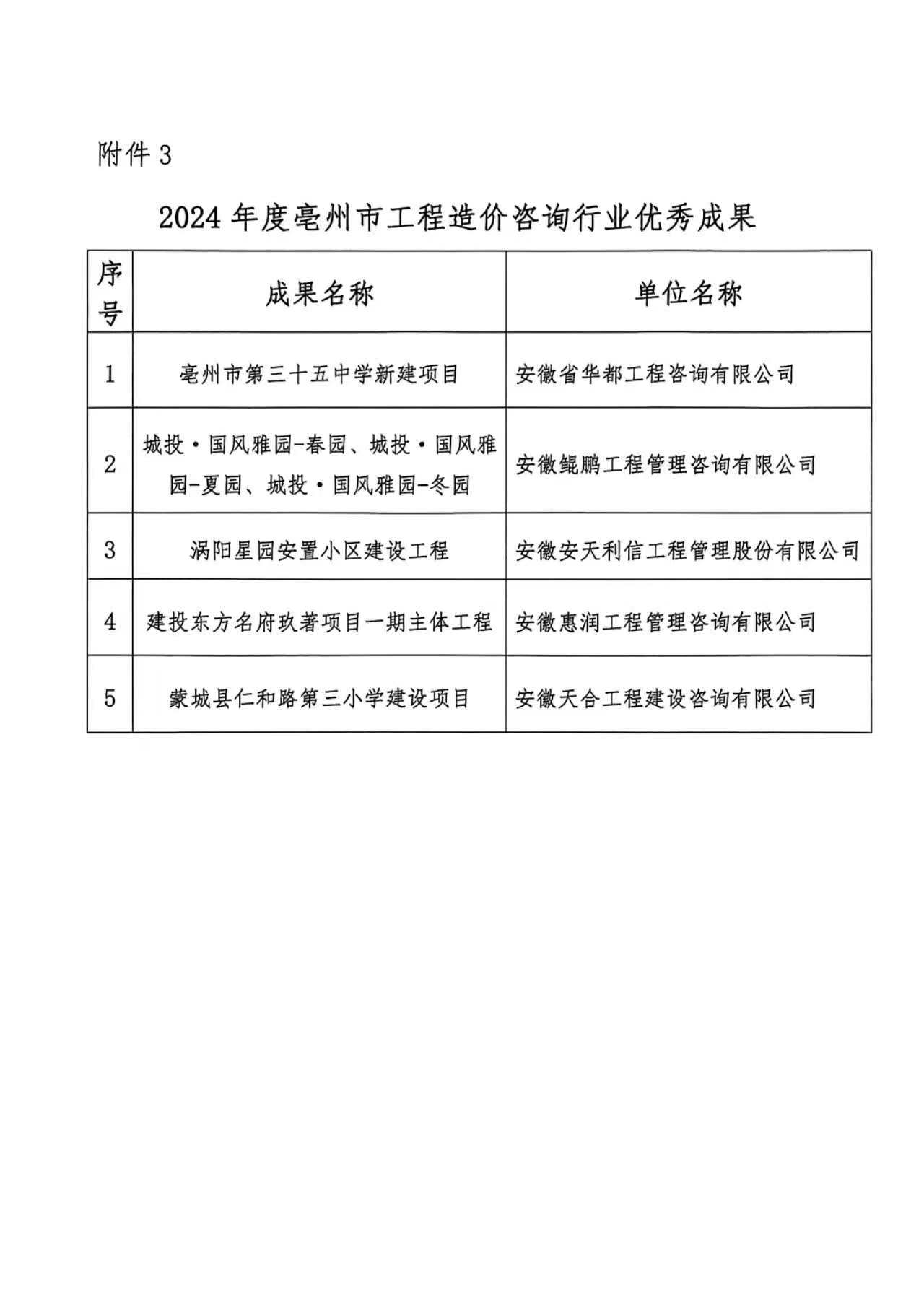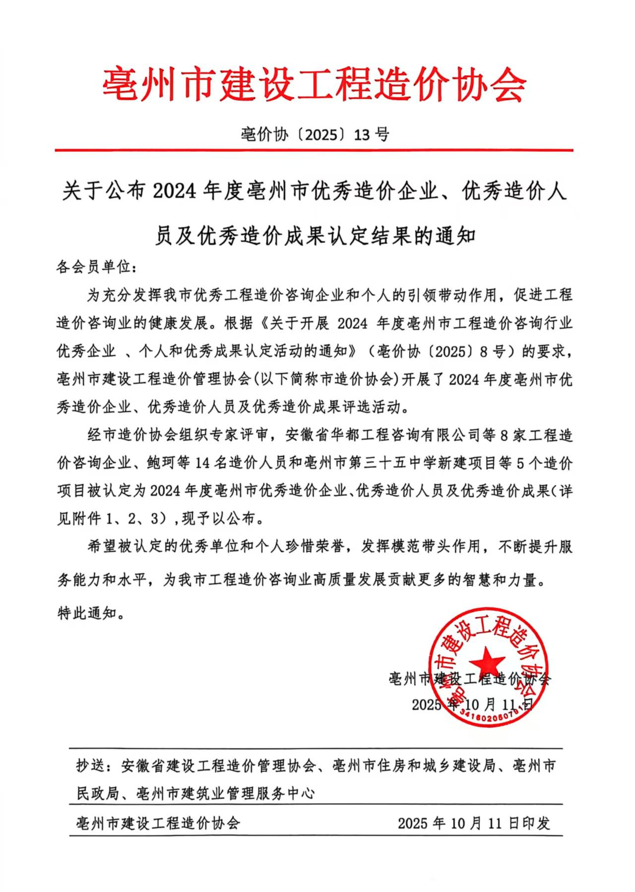 关于公布2024年度亳州市优秀造价企业、优秀造价人员及优秀造价成果认定结果的通知